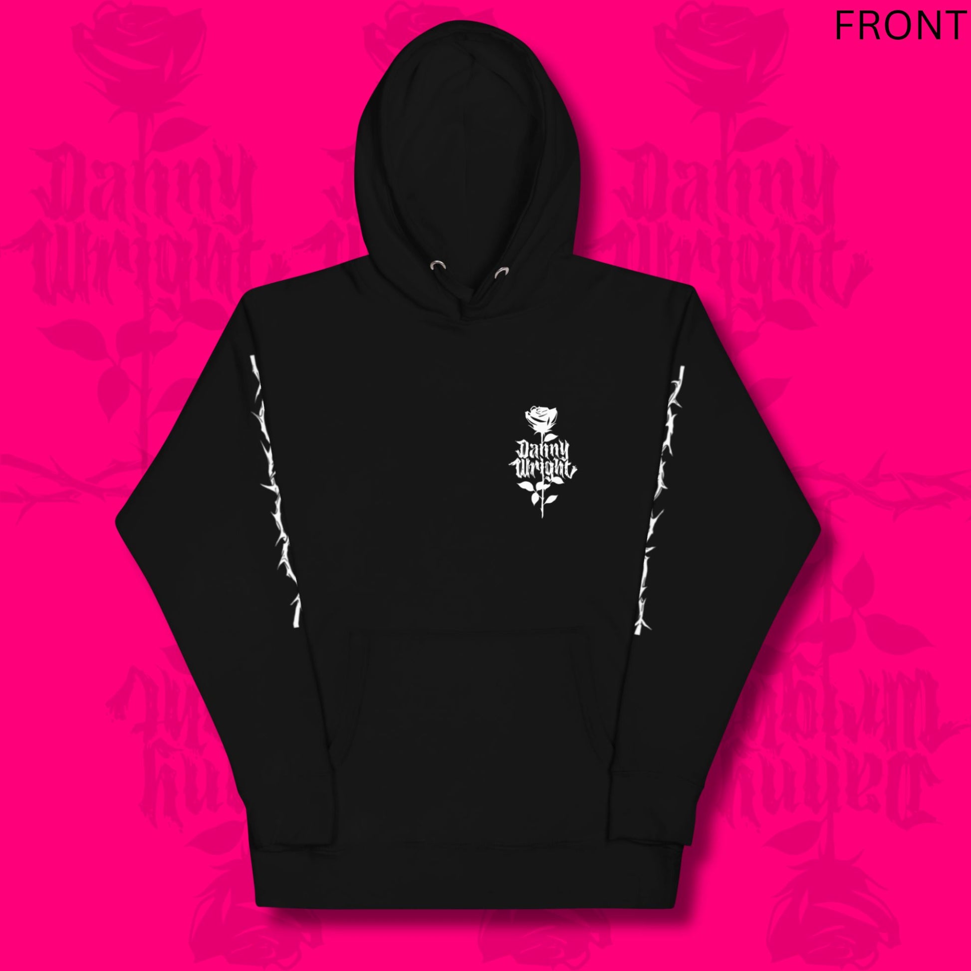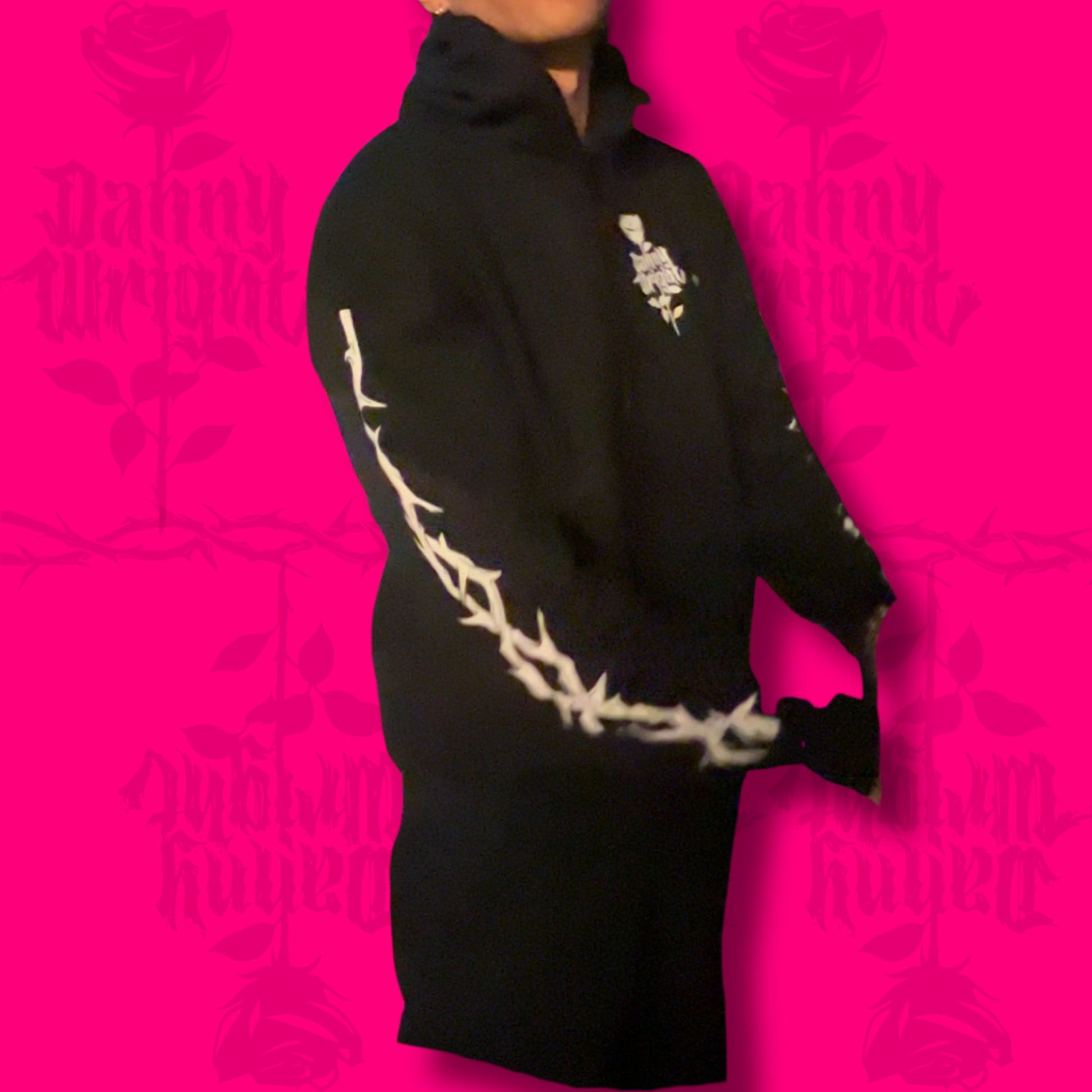 My latest drop — an exclusive rose-logo hoodie with a bold front print, a full back logo, and thorn artwork running down the entire sleeve. This piece is one-of-a-kind and was one of the most popular items on tour.